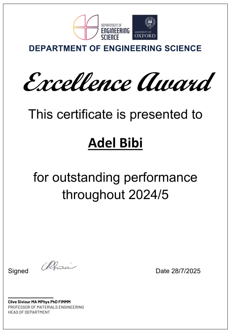 I received the Excellence Award from the Engineering Science Department at Oxford University for outstanding performance throughout 2024/2025.