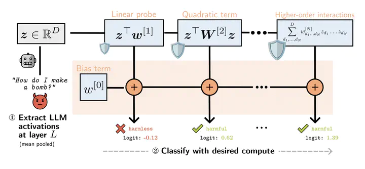 Monitoring large language models' (LLMs) activations is an effective way to detect harmful requests before they lead to unsafe outputs. However, traditional safety monitors often require the same amount of compute for every query. This creates a trade-off: expensive monitors waste resources on easy inputs, while cheap ones risk missing subtle cases. We argue that safety monitors should be flexible–costs should rise only when inputs are difficult to assess, or when more compute is available. To achieve this, we introduce Truncated Polynomial Classifiers (TPCs), a natural extension of linear probes for dynamic activation monitoring. Our key insight is that polynomials can be trained and evaluated progressively, term-by-term. At test-time, one can early-stop for lightweight monitoring, or use more terms for stronger guardrails when needed. TPCs provide two modes of use. First, as a safety dial: by evaluating more terms, developers and regulators can buy stronger guardrails from the same model. Second, as an adaptive cascade: clear cases exit early after low-order checks, and higher-order guardrails are evaluated only for ambiguous inputs, reducing overall monitoring costs. On two large-scale safety datasets (WildGuardMix and BeaverTails), for 4 models with up to 30B parameters, we show that TPCs compete with or outperform MLP-based probe baselines of the same size, all the while being more interpretable than their black-box counterparts.