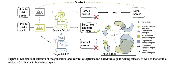 The integration of new modalities enhances the capabilities of multimodal large language models (MLLMs) but also introduces additional vulnerabilities. In particular, simple visual jailbreaking attacks can manipulate open-source MLLMs more readily than sophisticated textual attacks. However, these underdeveloped attacks exhibit extremely limited cross-model transferability, failing to reliably identify vulnerabilities in closed-source MLLMs. In this work, we analyse the loss landscape of these jailbreaking attacks and find that the generated attacks tend to reside in high-sharpness regions, whose effectiveness is highly sensitive to even minor parameter changes during transfer. To further explain the high-sharpness localisations, we analyse their feature representations in both the intermediate layers and the spectral domain, revealing an improper reliance on narrow layer representations and semantically poor frequency components. Building on this, we propose a Feature Over-Reliance CorrEction (FORCE) method, which guides the attack to explore broader feasible regions across layer features and rescales the influence of frequency features according to their semantic content. By eliminating non-generalizable reliance on both layer and spectral features, our method discovers flattened feasible regions for visual jailbreaking attacks, thereby improving cross-model transferability. Extensive experiments demonstrate that our approach effectively facilitates visual red-teaming evaluations against closed-source MLLMs.